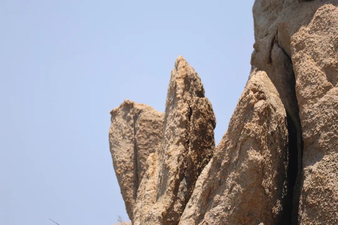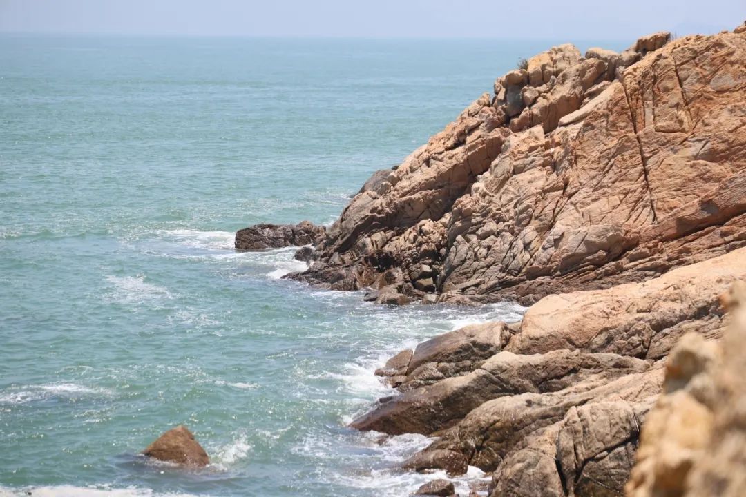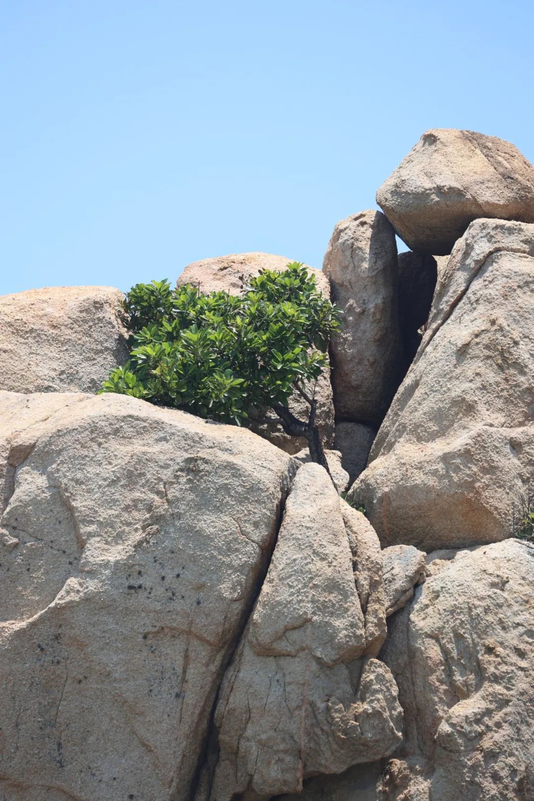 循路向岛中央的主峰挺进,青洲顶有巨石矗立,磐石巍然。瞰视全岛,其山势中部高,四周渐低,东西迤逦。花岗岩构成的山体坡度陡峭,岩骨嶙峋,但乔木、高草、灌木等各类植被却极为茂盛,在一片蔚蓝中点缀几分青翠。