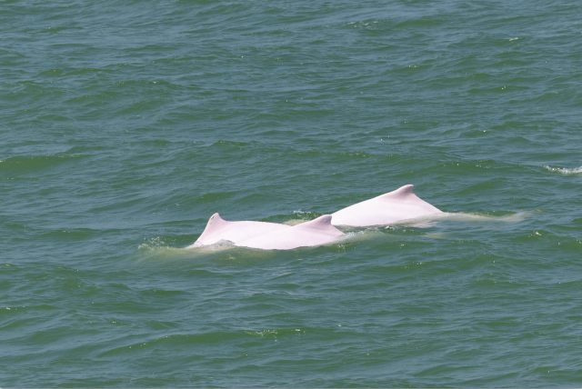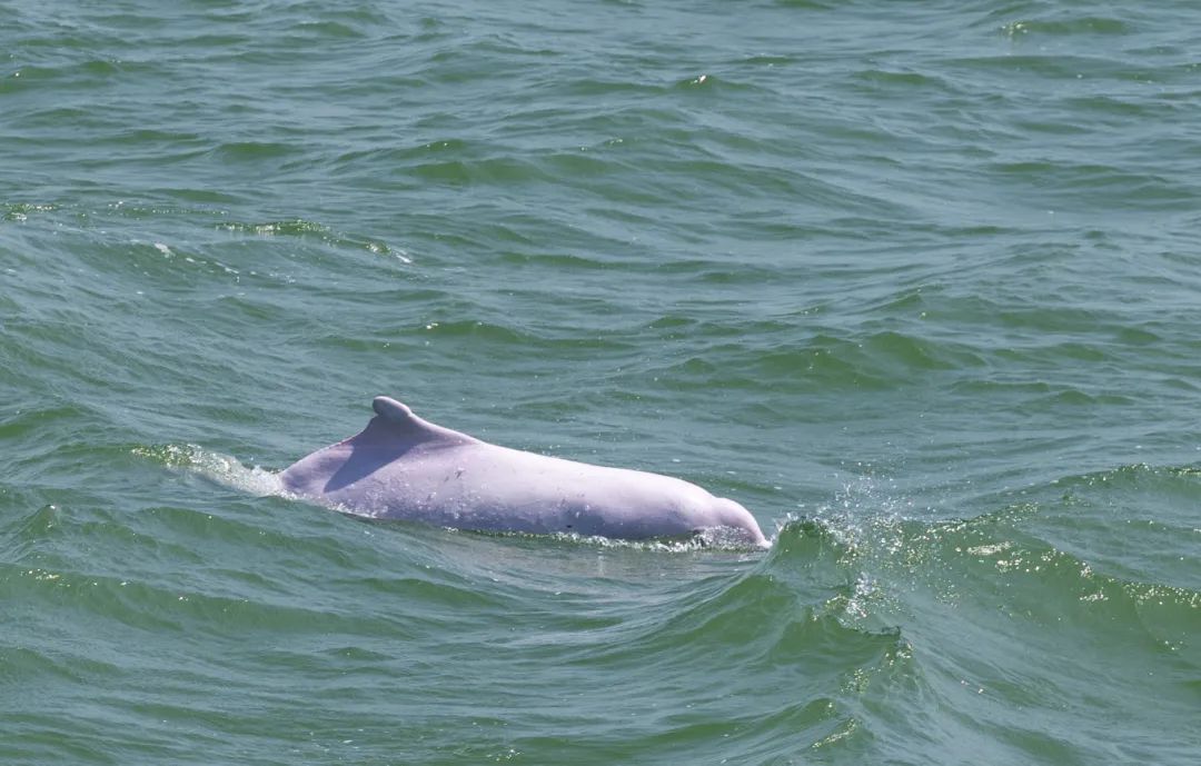 “快看!有白海豚!”众人惊喜之余回头远眺。离岸百余米的海面上,数头中华白海豚正追逐、翻跃,露出水面的肚子呈现粉白色。一闪而过,又隐入海中。